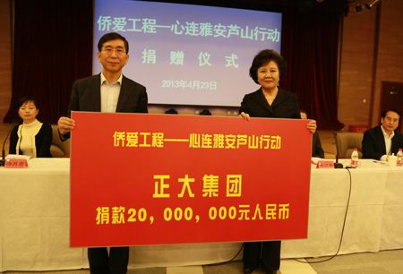 2013年4月20日8時(shí)02分,四川省雅安市蘆山縣發(fā)生7.0級地震。消息傳來(lái),舉國震動(dòng)。中國人民心連心,一方有難八方支援,全國人民與雅安人民站在一起。社會(huì )各界紛紛伸出了援助之手,對災區進(jìn)行了各種形式的捐助、支持與幫助。4月23日,正大集團為雅安地震災區捐款人民幣2000萬(wàn)元,集團(北京)董事長(cháng)辦公室楊海浩總裁代表集團出席國務(wù)院僑辦舉行的“僑愛(ài)工程——心連雅安蘆山”行動(dòng)捐贈儀式。
