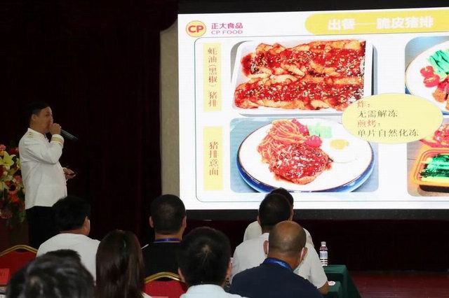 注冊中國烹飪大師、洛陽(yáng)正大食品研發(fā)廚務(wù)總監張立新先生向團餐大會(huì )介紹了洛陽(yáng)正大食品開(kāi)發(fā)的十余款預制豬肉調理產(chǎn)品,并從后廚實(shí)操角度分享了產(chǎn)品特色和賣(mài)點(diǎn),逐一介紹了出餐加工標準和配餐流程。