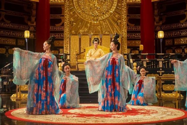 中秋夜游天堂名堂,大殿載歌載舞,仿佛回到千年前大唐盛世。中秋之日,一群盛裝歌姬白天登闕樓一睹恢弘盛世,傍晚在河邊放逐水燈許愿、思念家鄉,夜晚在華麗的舞臺歌舞升平。一派大國盛世、國泰民安的場(chǎng)景。